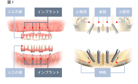 ※通常のインプラントは奥歯にもインプラントを埋め込みます。奥歯周辺には太い神経・血管や上顎洞があり、そこにインプラントを埋め込むためには、神経・血管の移動手術、上顎洞を持ち上げる手術(サイナスリフト)を必要とする場合があります。(上記図1参照)