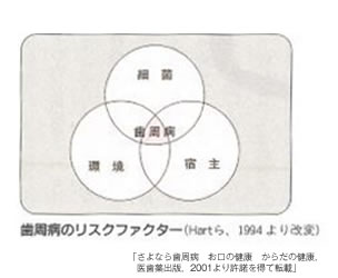 ―歯周病の原因の一つとして、全身の健康状態が考えられます。前項でお伝えしました歯肉炎の始まりは、プラーク(バイオフィルム)によって起こりますが、その危険性を高め、病気を進行させる因子(リスクファクター)は右の図のように3つに分けられます。